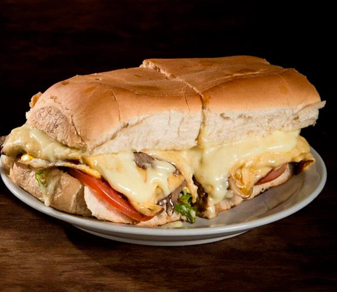 | LOMO VEGETARIANO SUPER: Mayonesa casera, doble queso, huevo, lechuga, tomate, cebolla cocida a la plancha, ají, picles. |
