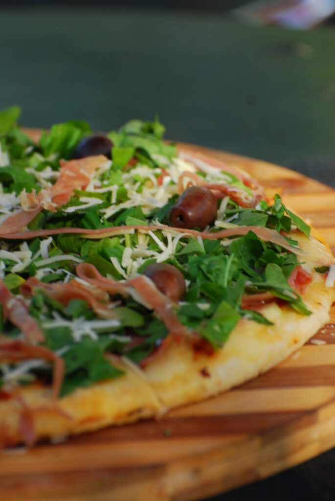 | RÚCULA Salsa, muzzarella, rúcula, jamón crudo, queso parmesano, orégano y aceitunas negras |
