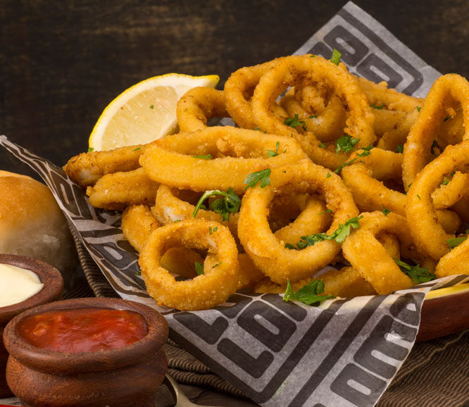 | RABAS PARA DOS Aros de calamar rebozados y fritos con salsa pisco, mayonesa casera y gajos de limón. |