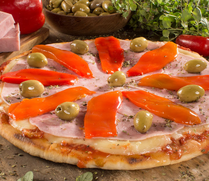 ESPECIAL Salsa de tomates frescos, muzzarella, jamón cocido, morrón, orégano y olivas |